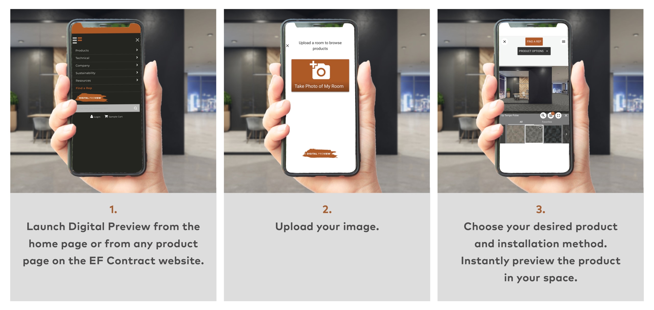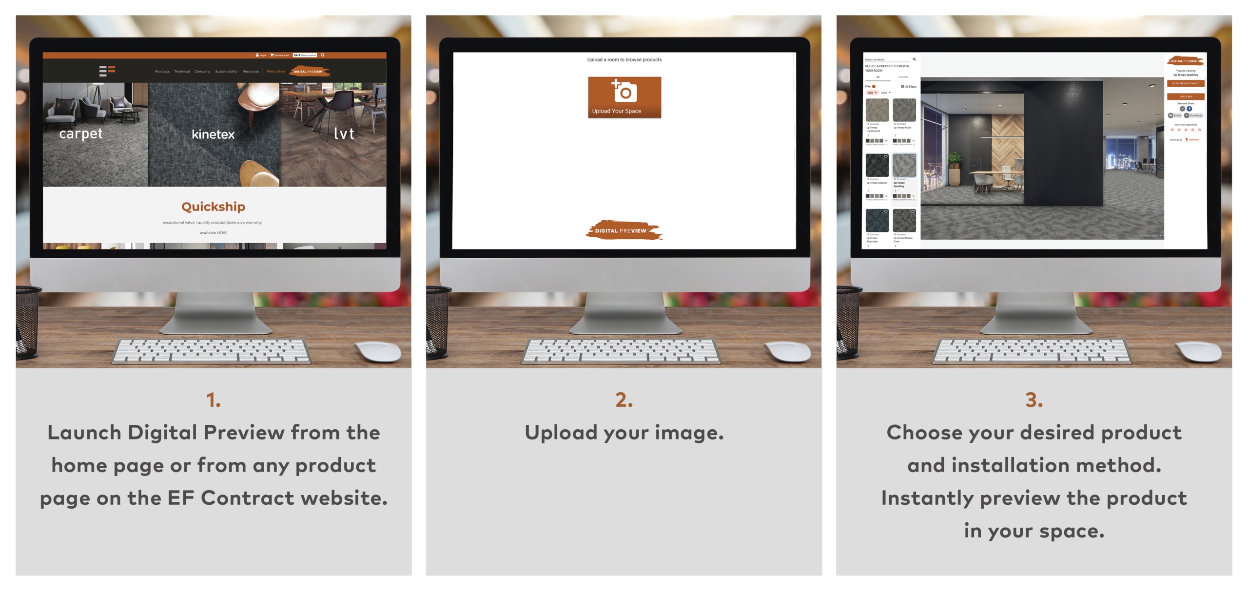 Digital Preview is a new visualization tool that allows users to upload a picture of their space and install EF Contract products, giving them an immediate view of how our product looks in their space. Users can choose from our modular carpet, broadloom, Kinetex and LVT. Optimized for both mobile and desktop, it requires no downloads or special apps and offers instant results for users.